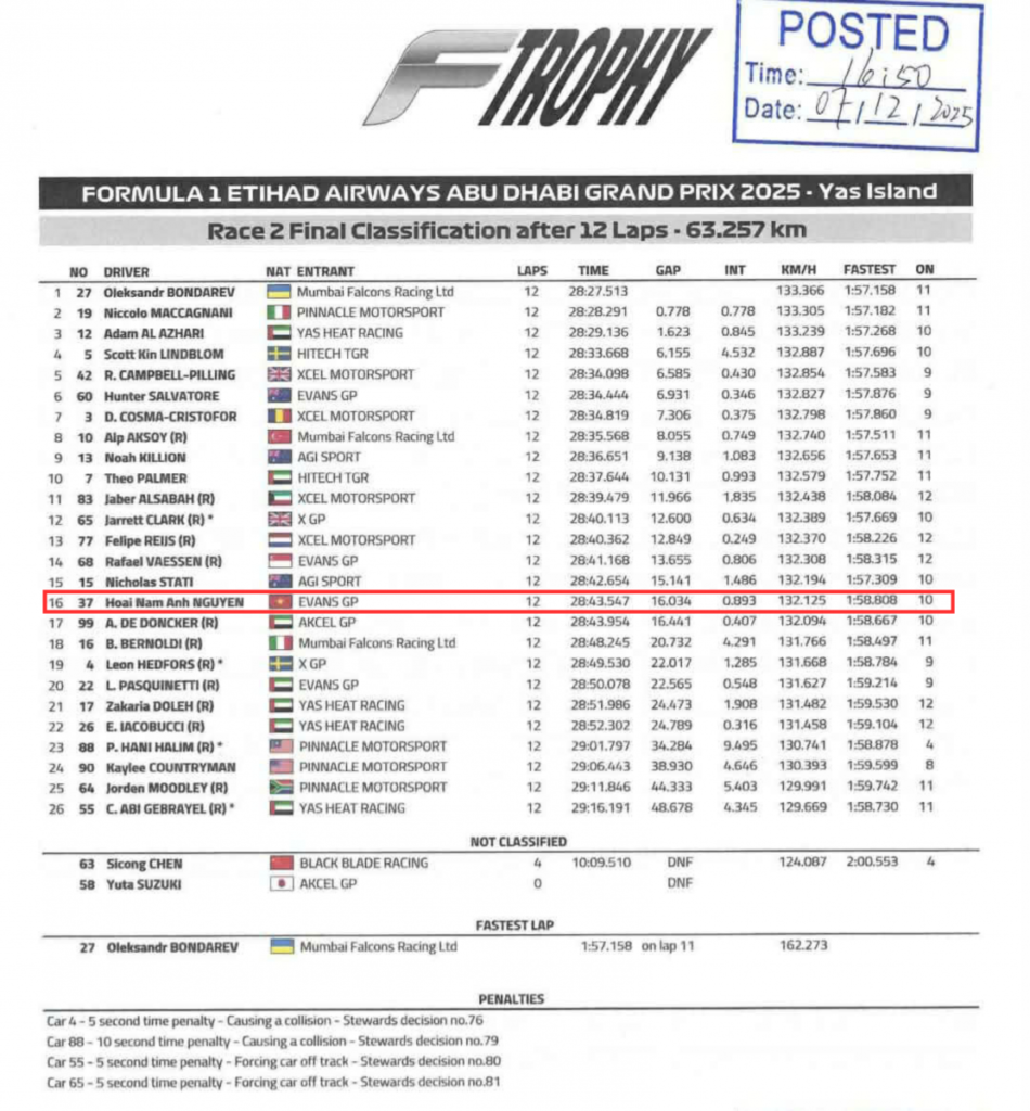 Tại Yas Marina Circuit, chặng đua quy tụ 28 tay đua đến từ 21 quốc gia, Ben là đại diện duy nhất của Việt Nam tham gia tranh tài. Với phong độ ổn định và bản lĩnh thi đấu chắc chắn, anh đã lọt top 16 tay đua F4 hàng đầu thế giới – một cột mốc lịch sử với motorsport Việt Nam, nơi chưa có hệ thống đào tạo bài bản cho xe công thức.